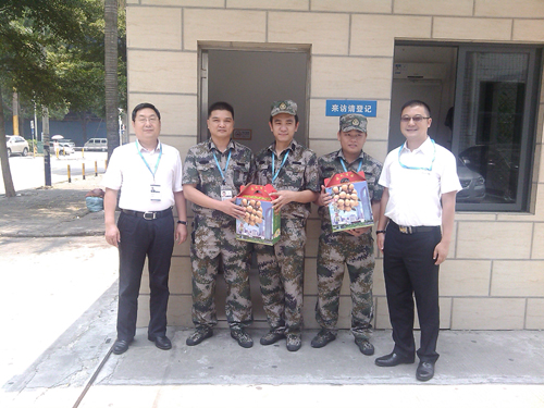 8月1日,正逢建軍節(jié),集團副董事長兼總裁吳光勝、首席科學(xué)家黃永江來到公司門崗,看望慰問在崗的保安人員,并送上節(jié)日禮品。 吳總強調(diào)“華訊方舟的保安就是華訊方舟
